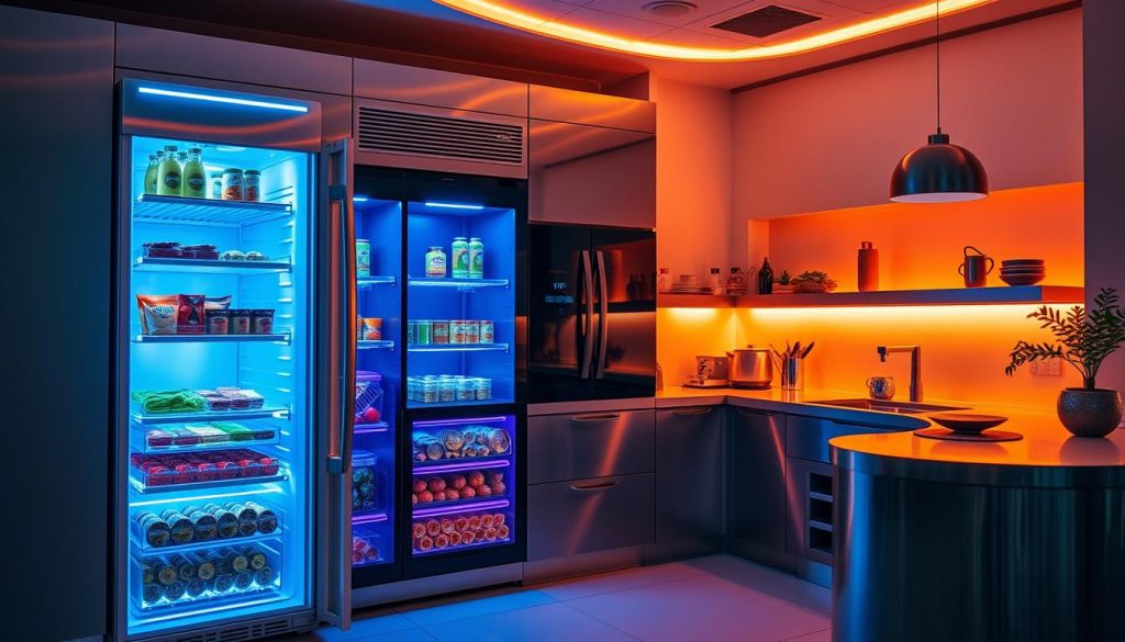 These fridges change how we use our kitchens. They mix advanced LED lights with easy controls and smart connections. They offer mood lighting and save energy, making them a top choice for modern kitchens.