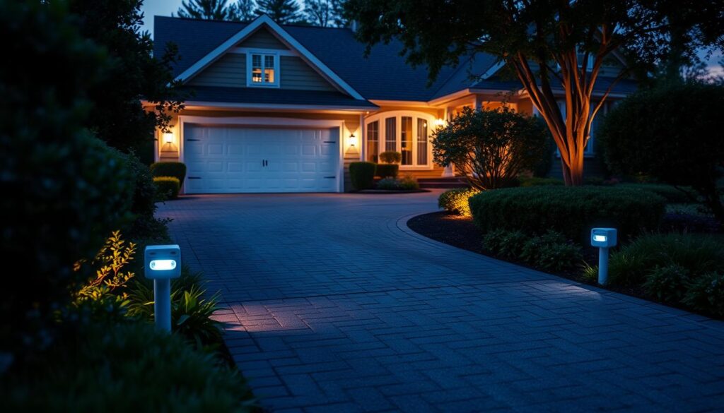 A serene suburban driveway at dusk, featuring modern driveway sensors discreetly placed among lush vegetation, with an inviting house in the background, soft lighting highlighting the sensors, creating a sense of security and tranquility.