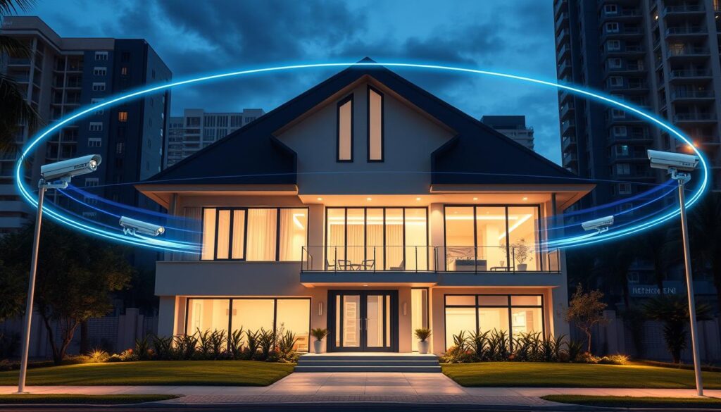 A futuristic home surrounded by invisible surveillance beams, with security cameras seamlessly integrated into smart devices, glowing softly in a high-tech urban setting at dusk, featuring sleek architectural lines and intelligent lighting, conveying a sense of safety and innovation.