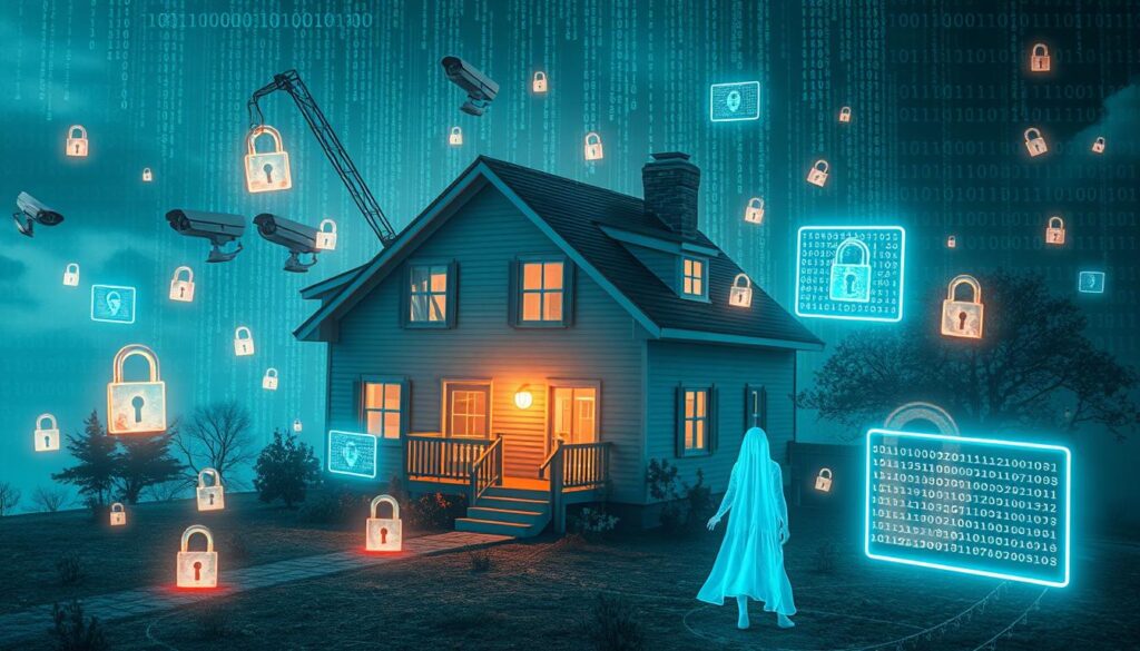 A surreal depiction of a house surrounded by a digital landscape, with floating binary code and glowing firewall barriers, emphasizing the tension between home security and online privacy threats. Elements like surveillance cameras, broken locks, and ghostly figures representing data breaches intertwine with the architecture of the home, creating an atmosphere of unease around digital footprints.