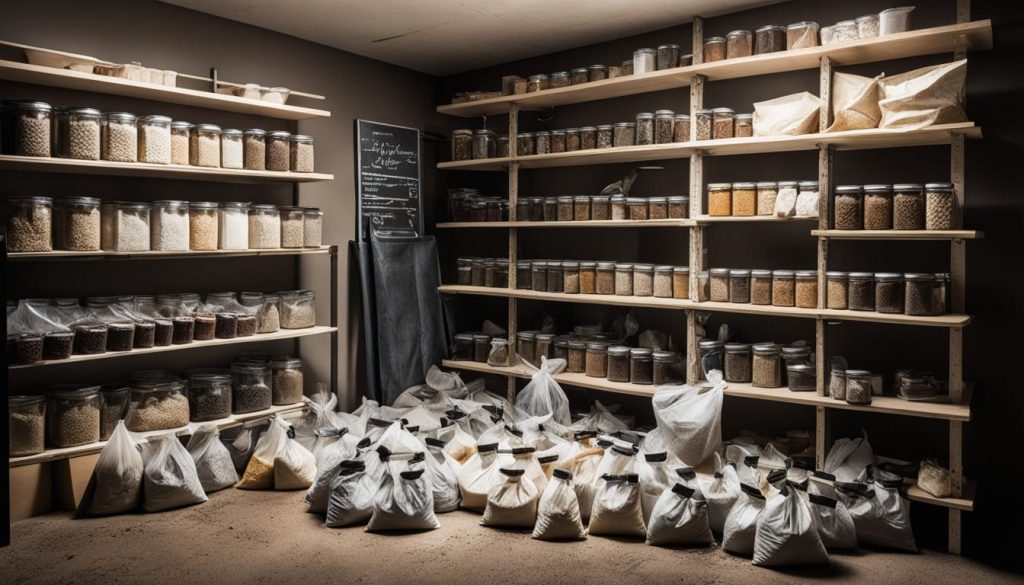 A dark and cluttered pantry with shelves containing bags and jars of coffee beans in various sizes and colors. Some bags are torn open and spilling their contents onto the floor while others are crumpled and forgotten. The lighting is dim and there are cobwebs hanging from the ceiling. A lone coffee mug sits on one of the shelves, dusty and unused.