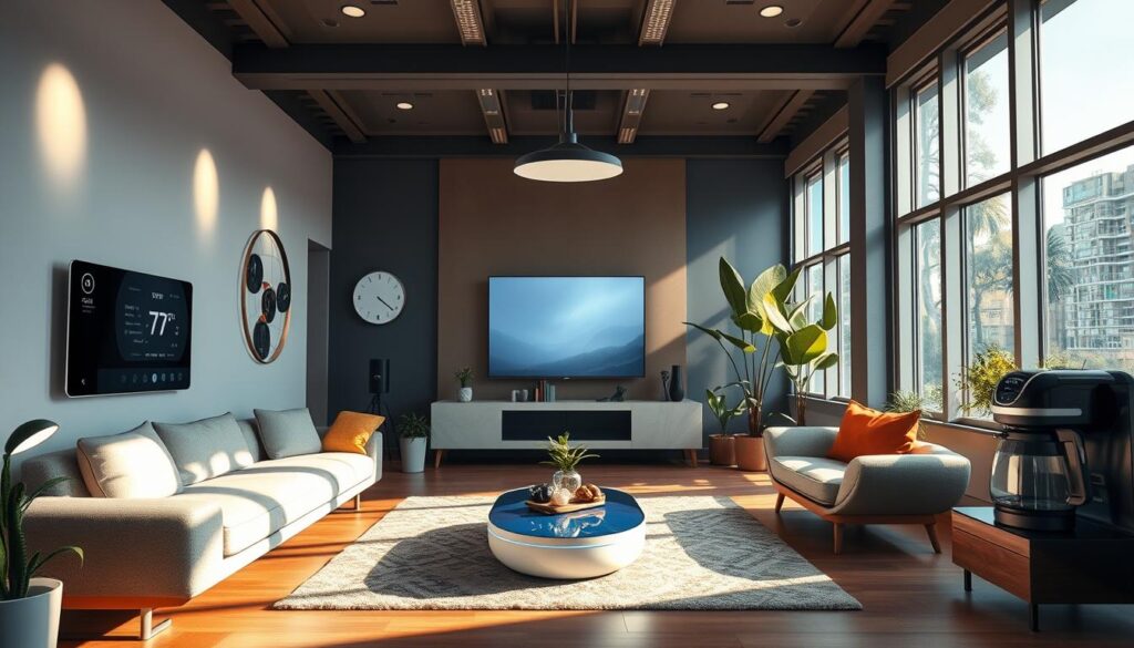A futuristic living room with an integrated voice home assistant device, surrounded by smart home appliances like automated lights, a smart thermostat, and a sleek coffee maker. The room features modern furniture, large windows with natural light, and plants for a touch of nature, all showcasing a seamless blend of technology and comfort.